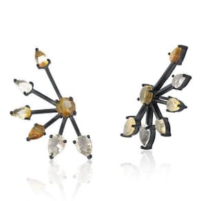 Brinco Leque com Cristais em Gota e redondo rutilados, ambos na Cor Marrom Folheado a Ródio Negro. Design diferenciado e qualidade que você vai amar. Arrase