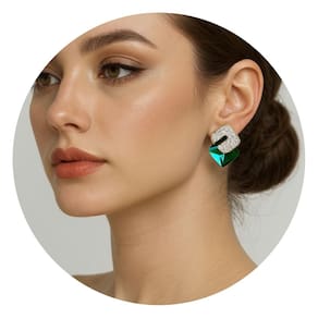 Com design diferenciado, esse brinco apresenta um formato losangular com zircônias brilhantes na parte superior e um cristal verde esculpido em corte piramidal na base. Um visual ousado e sofisticado.