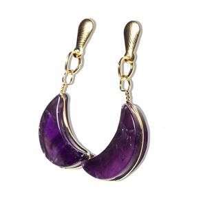 Nome da Pedra: Ametista Cor: Roxo intenso e vibrante, que transmite serenidade e equilíbrio (foto ilustrativa). Lapidação: Formato navete em meia lua, com polimento artesanal. Claridade: Opaco, sem transparência. Medida das Pedras: 7 mm e 10 mm. Medida Total do Brinco: Aproximadamente 4 cm. Peso: Cerca de 2 g por lado. Material da Montagem: Metal niquelado em flash dourado. Origem: Produzido artesanalmente em Curvelo, Minas Gerais.