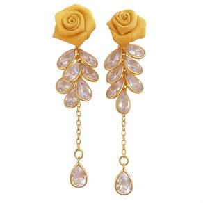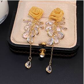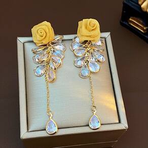 No topo, uma pequena rosa em tecido metalizado confere textura e charme artesanal. Abaixo, as gotículas de cristal se organizam em camadas, imitando o orvalho sobre pétalas, e culminam em uma gota alongada que balança levemente, despertando olhares. Com aproximadamente 6 cm de comprimento total, é leve o suficiente para usar o dia todo sem perder o conforto.
