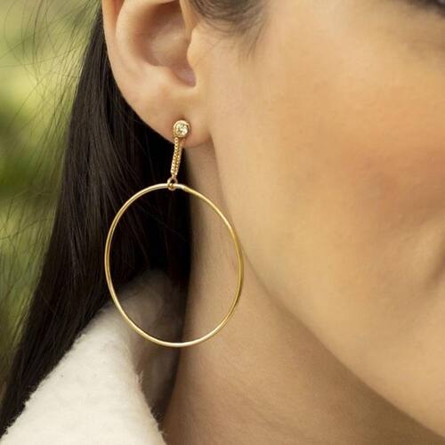 Feito em material folheado a ouro, o Brinco Pêndulo Redondo possui um peso de 7g, altura de 6.1cm e largura de 1.6cm. Seu formato redondo e ponto de luz banhado a ouro trazem um charme único e especial para o seu visual.
