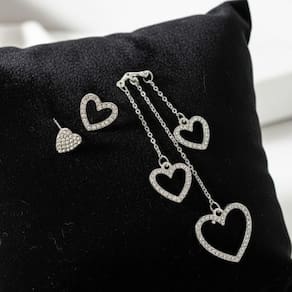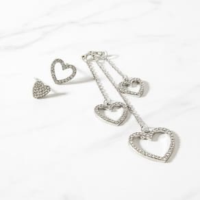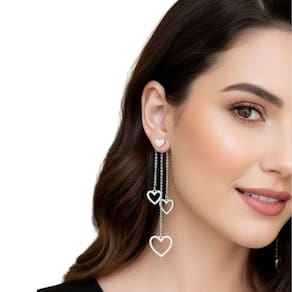 Brinco elegante em formato de corações vazados, com design moderno e sofisticado. Produzido em liga metálica de alta qualidade com acabamento prateado e detalhes em strass brilhantes. O modelo apresenta dois corações suspensos por correntes finas, criando um visual leve e feminino. Ideal para ocasiões especiais ou para dar um toque de brilho ao seu dia a dia.
