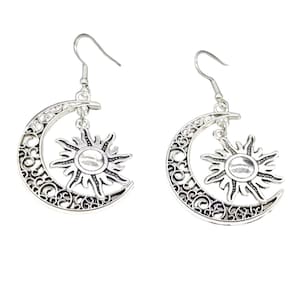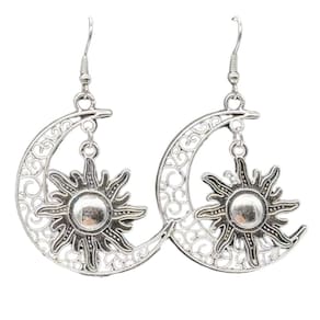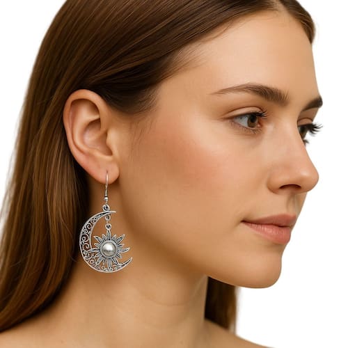 Imagine levar um pedacinho do céu para o seu visual diário: os brincos prateados de Lua e Sol trazem um design boho chic que combina romantismo e personalidade. Feitos em metal prateado de alta qualidade, eles mesclam a delicadeza da meia-lua vazada com o relevo central do sol, criando um efeito tridimensional que capta a luz a cada movimento.