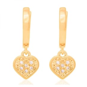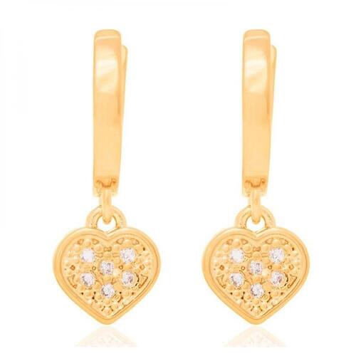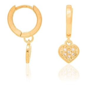 - Par de brinco formato argola com pingente de coração pendurado. Cada coração possui 6 pedras de zircônias cravejadas.