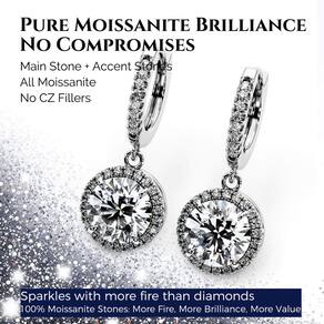 Estes brincos apresentam uma pedra central de moissanite radiante cercada por uma auréola de detalhes brilhantes de moissanita, proporcionando um brilho que supera em muito as alternativas de zircônia.