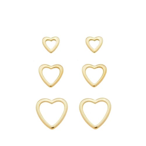 Brinco Trio de Corações Vazado: medida aproximada dos corações - pequeno 0,6x0,5cm, médio 0,8x0,7cm e maior 1,0x0,9cm