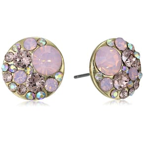 Brincos de disco redondo embelezados com delicados detalhes em pedra tonal rosa. Os brincos são incrustados em metal dourado com um fecho traseiro.