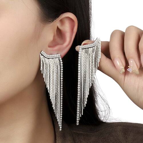 Design sofisticado com strass: Brincos longos com franjas decoradas com strass, ideais para quem deseja um visual glamouroso em casamentos e festas.Brilho prateado: O acabamento prateado, aliado ao strass, confere um brilho intenso, destacando o rosto em eventos noturnos.Comprimento longo: O formato pendente alongado traz elegância, realçando o look com um toque moderno e elegante.Material resistente e confortável: Fabricados com materiais de alta qualidade, os brincos são leves e duráveis, oferecendo conforto durante horas de uso.Estilo versátil: O visual prateado com strass é fácil de combinar com penteados e roupas de festa, adaptando-se a diversas produções.