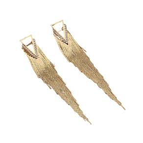 A delicadeza dos detalhes em strass combinada com o design moderno do triângulo confere um charme especial a esses brincos, tornando-os uma opção sofisticada e versátil para diversas ocasiões. Além disso, a leveza das franjas adiciona movimento e graça ao acessório, garantindo um visual deslumbrante.