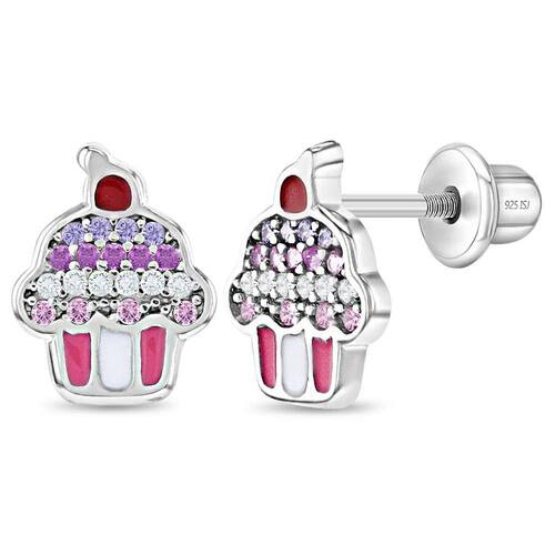 Um lindo par de brincos infantis de cupcake! Feito inteiramente em prata esterlina 925 com pedras de zircônia cúbica de cores divertidas. Esses brincos hipoalergênicos são seguros para crianças com ouvidos sensíveis. O design do parafuso de segurança ajuda a garantir que as costas dos brincos não caiam, oferecendo uma experiência confortável para seu filho. Uma caixa de presente está incluída para facilitar a entrega de presentes.