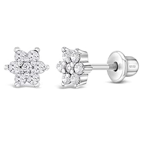 Deslumbrantes brincos de flores de zircônia multicúbica para meninas de todas as idades. A delicada flor de 5 mm está cheia de pedras CZ de qualidade em uma variedade de cores. Esses adoráveis brincos são feitos inteiramente de prata esterlina 925, um metal fino lmente HIPOALERGÊNICO, tornando-os seguros para ouvidos sensíveis. Eles apresentam postes rosqueados e um sistema de encosto de segurança para garantir que os brincos de seu filho permaneçam confortavelmente no lugar. Esses brincos são um lindo presente para qualquer ocasião, bem como para a moda diária de bebês, crianças pequenas e meninas. Uma caixa de presente está incluída para facilitar a doação!