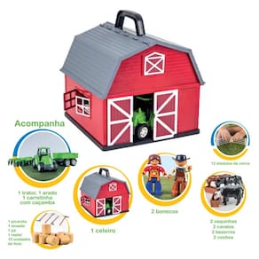 1 celeiro, 2 bonecos fazendeiros, 1 trator, 1 arado, 1 carretinha, 4 ferramentas manuais, 2 vaquinhas, 2 cavalos, 2 bezerros, 2 cochos, 12 módulos de cerca e 10 rolos de feno.