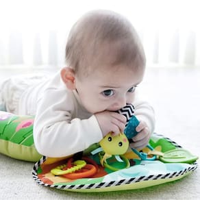 O design ergonômico ajuda a fortalecer os músculos, incentivando que o bebê fique na posição ideal para engatinhar. Possui mordedor, formas texturizadas, som de amassadinho e uma abelhinha, todos removíveis e supercoloridos para entreter e estimular os sentidos do pequeno.