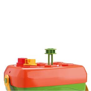 - baldinho para guardar ou carregar as peças, carregar água ou areia. - martelinho e prego para a criança bater e encaixar. - vários acessórios para a criança brincar. - peças de encaixar e ferramentas.