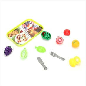 O brinquedo é composto por uma bandeja com diversas frutas de plástico, uma faquinha de plástico sem fio e um cesto. As crianças podem colocar as frutas na bandeja, cortá-las com a faquinha e colocá-las no cesto.