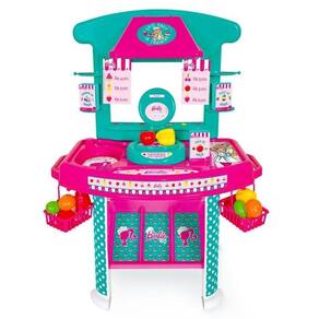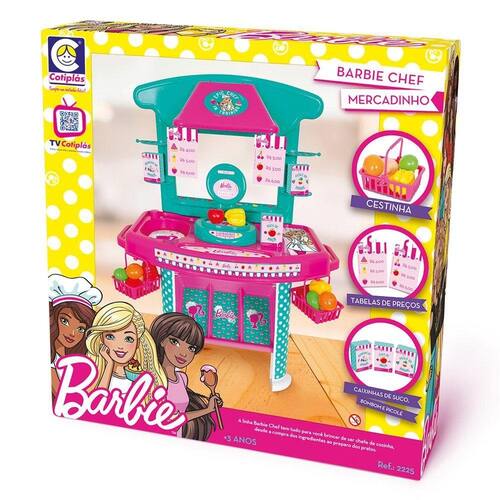 A linha Barbie Chef tem tudo para a criança brincar de ser chefe de cozinha, desde a compra dos ingredientes ao preparo dos pratos. As crianças vão adorar brincar com os Acessórios da Barbie, deixando o momento de diversão ainda mais legal. Itens Inclusos: 1 Mercadinho, 2 Cestinhas, 1 Balança, 2 Tabelas de Preço, 3 Caixinhas e 12 Peças entre Frutas e Legumes Código De Barras: 7896964622258 Código: 2225 Marca: Cotiplás Modelo: Barbie Mercadinho Serie: Chef Tamanho: 47x12x45 Aproximadamente Peso: 1000g Aproximadamente Certificado: Inmetro CeBri/Innac 0228 NM 300/2002 Ocp 0061 Produto Novo,Lacrado e Com Nota Fiscal.