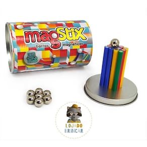as barras magnéticas são conhecidas como o brinquedo que estimula brincando: a coordenação motora, a criatividade, o conhecimento e aprendizagem das cores e formas, realização de piça fina e grossa, a curiosidade e a imaginação. Kit com 56 peças; contém; 36 barras coloridas, 20 ;