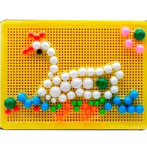 O brinquedo é composto por uma base para encaixe dos pinos que possibilita a criação de infinitos desenhos coloridos e interativos.