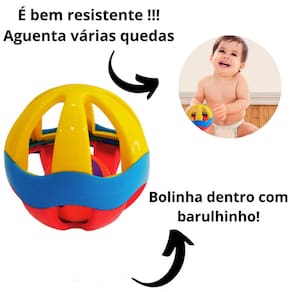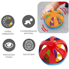 • Com seu design colorido e atrativo, a bolinha irá encantar os pequenos enquanto eles brincam. Basta agitar a bolinha para que o chocalho interno produza sons, estimulando a audição e coordenação motora do bebê.