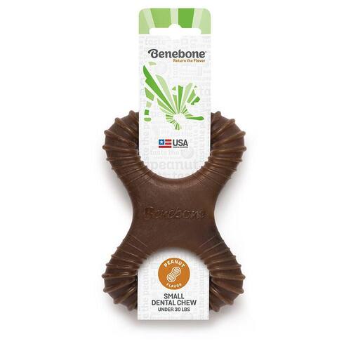 Amendoins são os campeões do sabor. São utilizados durante uma partida de futebol para aliviar o tensão e ao mesmo tempo são os petiscos favoritos dos elefantes usamos nada além de nylon e amendoins de verdade para tornar o benebone irresistível para os cães. Eles ficarão malucos com isso. Roer é uma necessidade canina. Fazem isso porque faz parte dos seus hábitos naturais. O problema é quando roem móveis e utensílios da casa e benebone é a solução para um cão feliz e satisfeito. Os benebones são mundialmente conhecidos pela durabilidade e por despertar enorme interesse dos cães, eles são projetados para manter o sabor por mais tempo do que a maioria dos brinquedos de mastigar, fazendo com que seu peludo fique roendo por horas O benebone dental chew amendoim possui forma ergonômica, confortável e fácil de manusear para cães, afinal eles não têm polegares O benebone dental chew amendoim é feito com nylon e temperado com amendoim de verdade. Os benebones não são comestíveis, sugerimos que sempre monitore a atividade do seu cão. Em geral, se pedaços do tamanho de arroz ou menores caem do benebone, estes geralmente não causam nenhum problema. Mas se você ver pedaços maiores caindo, descarte e substitua. Recomendamos a mensal, ou antes, se apresentar sinal de desgaste. Os benebones não são feitos para filhotes muito novos que podem ter dentes em desenvolvimento ou cães mais velhos com problemas dentários. O peso indicado é apenas uma referência, não pode substituir o julgamento do dono que conhece o seu cão, o tamanho da boca, a força de mastigação e a força do dente. Em caso de dúvida, escolha o tamanho maior por razões de segurança. Tamanho pequeno - cães até 13 kg menos 30 lbs . Medidas aproximadas: 14 x 8,5 cm. Ean: 854111004149 Marca: Não Informado