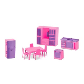 Contém: - boneca judy. - fogão. - geladeira. - armário. - pia. - mesinha. - cadeiras. - incluso acessórios para sua boneca e adesivos.