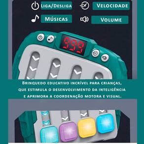 Brinquedo Console Educacional Jogo Coordenação Motora Desafie seus reflexos ao ritmo da diversão O console inteligente é um excelente brinquedo educativo para crianças, ajudando a aumentar sua inteligência e coordenação mão-olho através de níveis de desafio. É um presente perfeito para crianças, trazendo-lhes alegria. O brinquedo musical que vai colocar os reflexos à prova Vantagens: - Estimula a coordenação motora; - Estimula raciocínio rápido; - Cores vibrantes; - Várias músicas animadas; - Proporciona diversão e desafios; - Perfeito para todas as idades Console Jogo Interativo Rhythm Master Recursos: Experiência Envolvente: Botões iluminados que mudam de cor conforme as trilhas musicais, proporcionando uma experiência visual e sonora única. Controle de Velocidade e Volume: Três níveis de velocidade para aumentar o desafio e quatro ajustes de volume para garantir conforto auditivo. Teclas Inteligentes: Luzes indicam acertos e erros com cores diferentes, tornando o jogo dinâmico e intuitivo. Desligamento Automático: Economia de energia com desligamento após dois minutos de inatividade. Material Resistente: Construído com plástico durável para garantir muitas horas de diversão. Portátil: Tamanho compacto 15 x 11 x 3 cm , fácil de transportar e ideal para brincar em qualquer lugar. Especificações: Cor: Aleatoria conforme disponivel em ; Dimensões: 15 cm x 11 cm x 3 cm; Material: Plástico durável; Energia: Funciona com pilhas não incluídas . Conteúdo da Embalagem: 1x Console Rhythm Master Game Machine. -13 Homologação Inmetro: IP-BRI-1217/2021-13 Marca: Não Informado Ean: 7908728372269