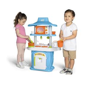 Cozinha completa com dois lados para brincar! De um lado uma geladeira com dispensador de água na porta que funciona de verdade, fogão e um forno de micro-ondas que faz barulho igual ao da mamãe! Do outro, um forninho e uma pia que vem com uma torneira que sai água! Nela dá para lavar os pratinhos, talheres, copos e panelinhas que vem junto com a Le Grand Chef!