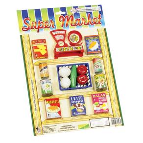 Contém: 1 balança, 1 caixinha de spaguetti, 1 caixinha de leite, 1 guaraná, 1 lata de milho, 1 caixinha de biscoito, 1 caixinha de sucrilhos, 1 caixinha de bala, 1 lata de ervilhas, 1 suco de laranja, 1 cesto, 2 maças, 1 pepino e 2 ovos.
