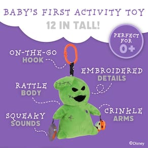 KIDS PREFERRED Disney Baby Nightmare Before Christmas Oogie Boogie On The Go Brinquedo de atividade com mordedor, clipe em movimento, sino e braços de puxar - BRINQUEDO DE DESENVOLVIMENTO: Ajude o bebê a aprender e crescer com um brinquedo de atividade da Disney Baby que inclui braços que puxam, mordedores, carrilhão e clipe em movimento - Brinquedo macio para dentição: materiais interativos mantêm o bebê envolvido. O animal de pelúcia macio tem mordedores com formas e texturas divertidas para mastigar e acalmar os dentes e gengivas do seu bebê - PRIMEIRO BRINQUEDO DO BEBÊ: Um item essencial para bebês, este brinquedo de assento de carro e carrinho de bebê é ideal para chás de bebê e novas boas-vindas e é popular para meninos e meninas de 0 meses a crianças. - Muita diversão: fitas para dedinhos e cores brilhantes mantêm os bebês envolvidos, entretidos e relaxados. Este brinquedo infantil interativo encanta bebês com texturas, sons musicais e cores brilhantes para descobrir - BRINQUEDOS CLÁSSICOS MODERNOS PARA BEBÊS: O Maravilhoso Mundo dos personagens icônicos da Disney são instantaneamente reconhecíveis, trazendo doces memórias de sua própria infância enquanto ajudam seu filho a aprender, brincar e crescer