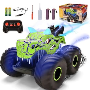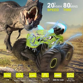 As crianças vão adorar este carro de dinossauro porque ele tem muito o que brincar. Este carro de controle remoto para meninos de 4 a 10 anos pode fazer acrobacias como girar no lugar, andar na vertical, caminhar na vertical e rotação de 360°. Com os botões no controle remoto, você pode fazer o carro monstro dinossauro fazer manobras incríveis. Você ficará surpreso com a agilidade e flexibilidade deste carro RC para meninos de 4 a 7 anos. O carro RC para meninos de 8 a 12 anos vem com um controle remoto de banda de 2,4 GHz e duas baterias substituíveis, permitindo que vários jogadores joguem juntos sem interferir um no outro. Duas baterias recarregáveis garantem uma longa vida útil da bateria. Você pode carregar as baterias usando o cabo USB, que se conecta a uma variedade de dispositivos, como computadores, carregadores bancários, tomadas e muito mais. O Monster Truck para meninos é feito de material ABS durável que pode suportar batidas e batidas. As rodas de borracha são antiderrapantes e podem se adaptar a uma variedade de terrenos, como grama, areia e cascalho. A carcaça do carro também é à prova d'água e fácil de limpar. Este caminhão de controle remoto é o presente perfeito para o seu filho. - ? Som esparso, leve e de dinossauro: este carro RC tem um visual de dinossauro único que fará seu filho rugir de emoção. As luzes frias e o som rugido do dinossauro tornam o caminhão monstro para meninos mais divertido de brincar em ambientes internos e à noite. As luzes têm três efeitos que podem ser ajustados com o controle remoto. O veículo de controle remoto também borrifa água e, combinado com as luzes, o spray traseiro é tão legal quanto um foguete impulsionador. - Carro RC com acrobacias: as crianças podem controlar facilmente o carro RC para fazer acrobacias, como girar 360° no lugar e se mover na vertical, não apenas para frente/para trás e para a direita/esquerda. Além disso, a aparência única do dinossauro atrai a atenção de meninos e meninas de 4, 5, 6, 7, 8, 9 e 10 anos. Um ótimo presente para fãs de dinossauros. - ? Potente controle remoto de 2,4 GHz – O caminhão de controle remoto para todos os terrenos está equipado com um controle remoto fácil de usar sem interferência com frequência de 2,4 GHz deixa o carro sempre pronto para funcionar e tem função sem interferência. A distância do controle de rádio é de cerca de 79 metros, não se preocupe em executar estes carros de controle remoto em pastagens, areias e terrenos acidentados. - Material superior: Feito de plástico ABS inofensivo de alta qualidade e elementos eletrônicos. Corpo do carro com material antiqueda ecológico, forte e resistente à queda, para lidar com uma variedade de operações infantis bárbaras; o chassi é alto e resistente, o caminhão monstro dinossauro Onadrive RC é resistente a colisões e não é facilmente danificado. Pneus de borracha com padrões de piso não apenas amortecem a vibração, mas também fornecem fricção adequada para evitar escorregões em superfícies lisas. - ? Presente perfeito para crianças: crianças que amam dinossauros não podem resistir a este caminhão monstro para meninos e meninas! Também pode trazer felicidade para seus filhos em qualquer ocasião, como aniversário, Natal, Halloween ou apenas para se divertir.