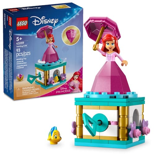 LEGO Brinquedo Ariel da Princesa da Disney – Brinquedo de montar para crianças, meninas e meninos, crianças a partir de 5 anos – Pequena sereia para fãs de filmes – ideia de presente de boneca Ariel - Pequena sereia de brinquedo: meninas e meninos a partir de 5 anos podem desempenhar papéis criativos com este brinquedo e kit de montar Ariel Girando baseado no filme A Pequena Sereia da Disney - Reencenar o filme – Este brinquedo de construção inclui um suporte com um toca-discos e chave, uma mini boneca Ariel LEGO da Disney em um vestido de "diamante" e um boneco de peixe da Disney Flounder LEGO - Brinquedo multifuncional – gire a chave no suporte para girar o prato e girar Ariel, então guarde o boneco da mini boneca LEGO da Disney dentro do vestido "diamante" usando o guarda-chuva como tampa - Conjunto de exibição montável: coloque Ariel, seu garfo e um guarda-chuva em exibição com este conjunto e adicione o linguado e o "diamante" ao suporte, ou jogue novas histórias com Ariel e Linguado - Ideia de presente para crianças – Este conjunto de montar da Disney da LEGO possui 2 personagens do filme e um suporte com placa giratória, tornando-o um presente de aniversário divertido que é fácil de brincar em movimento - Dimensões – o conjunto de montar com suporte e personagem mede mais de 10 cm. 11 cm de altura