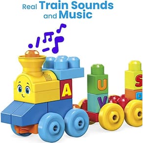 Crianças pequenas podem construir o ABC Musical Train e começar a aprender seus ABCs. Pequenos construtores podem conectar as 3 distâncias entre eixos rolantes e empilhar os blocos de letras na parte superior para aprender o alfabeto ou até mesmo criar palavras inteiras. Depois, seu filho pode pressionar a chaminé para descobrir sons reais de trens e uma música para adicionar magia musical à sua aventura alfabética.