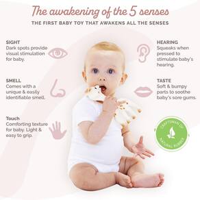- Sensorial: Sophie tem pontos escuros contrastantes e um corpo flexível, macio e leve, com muitas partes para mastigar (orelhas, chifres, pernas). Ela também está equipada com um apito exclusivo quando espremida.