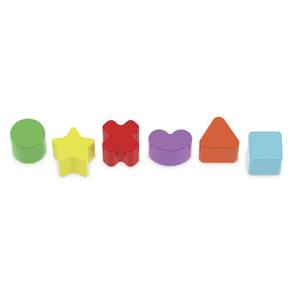 Acompanha 1 kit com 6 peças plásticas coloridas e ergonômicas, em diferentes formas geométricas, que se encaixam nas aberturas correspondentes da casinha.