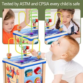 -?Portátil e fácil de armazenar?O labirinto de miçangas na parte superior dos brinquedos de madeira para crianças pode ser desmontado para brincadeiras individuais ou virado e colocado em uma caixa para facilitar o armazenamento, como uma atividade de mesa separada. O centro de atividades Play Cube tem o tamanho certo e não ocupa muito espaço, o que o torna perfeito para crianças pequenas viajarem.