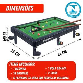 Brinquedo de mesa de bilhar snooker com 2 tacos Já parou para pensar em como é frustrante não ter um espaço divertido e interativo em casa Sem uma mesa de bilhar, as opções de entretenimento podem ser limitadas, e as reuniões com amigos podem perder a graça. A mesa de bilhar portátil é a solução ideal para transformar qualquer ambiente em uma verdadeira arena de diversão com um design prático e funcional, é perfeita para crianças, jovens e adultos, proporcionando momentos de lazer com conforto e conveniência. Você pode usá-la em casa, em festas ou até mesmo durante viagens, sem complicações Benefícios - diversão para toda a família - estrutura leve e resistente, pronta para uso imediato - superfície de feltro verde para jogadas suaves e realistas - design compacto que se adapta a diferentes superfícies - inclui um kit completo para partidas dinâmicas Especificações técnicas - dimensões da mesa: comp.: 44cm x larg.: 25cm x alt.: 15cm - tacos: comp.: 45cm - itens inclusos: 10 bolinhas coloridas, 1 bola branca, 2 tacos, 1 triângulo organizador - registro inmetro: 009179/2024 - não recomendado para menores de 3 anos Não perca a chance de criar momentos inesquecíveis com amigos e familiares adquira já a mesa de bilhar portátil e leve a diversão para onde você for Informações importantes sobre a compra - de fábrica Dúvidas frequentes: 2 - qual o prazo para envio do meu pedido 3 - a compra é confiável Resposta: desde a fundação da nossa empresa, temos milhares de clientes satisfeitos em outras lojas online. Somos uma loja oficial neste marketplace e oferecemos todas as garantias da plataforma, além da de fábrica. 4 - os produtos têm Resposta: sim, oferecemos de 30 dias em todos os nossos produtos. Se houver qualquer problema, resolveremos da melhor forma possível. 5 - a compra é segura Resposta: sim, garantimos total segurança na sua compra e sigilo dos seus dados. 6 - e se eu não gostar do produto, posso ter meu dinheiro de volta Resposta: de acordo com o cdc código de defesa do consumidor , todo cliente de compras online tem até 7 dias para devolver o produto em caso de arrependimento, sem custo na devolução. Você será reembolsado em 100% do valor da compra. Se tiver alguma dúvida, envie-nos uma mensagem e responderemos o mais rápido possível. -02 Homologação Inmetro: IP-BRI-1357/2021-02