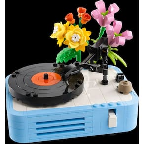 O toca-discos em estilo retrô possui um toca-discos móvel, um braço móvel com caneta stylus e 2 discos, além de flores LEGO removíveis