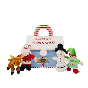 - A oficina do Papai Noel de pelúcia macia abre para revelar um conjunto de 4 unidades de brinquedos pequenos de pelúcia, sensoriais e apropriados para o desenvolvimento para manter o bebê entretido e curioso