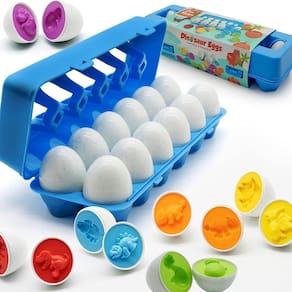 MOONTOY O conjunto de ovos de dinossauro combinando é um maravilhoso brinquedo de classificação de cores e formas. Com estes ovos educativos combinando, você pode treinar as habilidades de classificação e correspondência de seus filhos. Deixe seus filhos reconhecerem a cor e a forma quando dividirem os ovos. Este conjunto inclui 12 ovos de quebra-cabeça em forma de 6 cores, 24 meias peças no total. Realmente um ótimo pacote de presente! - Ótimos brinquedos de ovo combinando de dinossauros para crianças de 1 a 3 anos: 12 peças charmosas de dinossauro Montessori em uma caixa portátil contém 6 cores brilhantes e 12 formas exclusivas para ajudar crianças em idade pré-escolar a aprender a contar, classificar e combinar! Combine formas e cores, ótimo aprendizado de cores e formas, brinquedo combinando ovos para crianças de 1 2 a 3 anos de idade ou mais. - Exercício de habilidade motora fina: estes brinquedos educativos infantis brincam com ovos para crianças pequenas e bebês são perfeitos para os dedos pequenos agarrarem e abrirem. As crianças podem combinar as duas metades corretas e separá-las sem esforço, o que melhorará a destreza das mãos das crianças, o reconhecimento de cor e forma, melhorará a coordenação motora fina e desenvolverá habilidades de resolução de problemas. - Design seguro para crianças: sempre focamos em brinquedos de maior qualidade e mais seguros para crianças pequenas. Nossos quebra-cabeças coloridos são feitos de plástico sem BPA, bordas lisas polidas, sem rebarbas e grandes o suficiente para evitar riscos de asfixia. A capa de plástico resistente é super conveniente para armazenamento rápido e fácil. Ótimos brinquedos interativos de habilidade motora para crianças de 1 2, 3 e 4 anos. - Brinquedos STEM fantásticos: Nossos ovos de páscoa infantis têm vários usos. Como brinquedos Montessori educativos, brinquedos de contagem, brinquedos de jogos, brinquedos de jogo de memória, giroscópio, brinquedos de carimbo, recheios de cesta de Páscoa, etc. O brinquedo de ovo infantil com uma superfície lisa também é uma boa escolha para bricolage infantil, você pode decorar os ovos moldados com tinta colorida na Páscoa ou faça você mesmo como um presente para amigos. - Presente ideal para crianças: Brincar e aprender, estes ovos de dinossauro rachados são projetados para crianças para incentivar a criatividade e a exploração! É uma excelente escolha de presentes de Páscoa/Natal/Aniversário/Ano Novo/Dia das Crianças/Halloween/Ação de Graças para bebês, crianças, meninas e meninos.