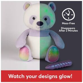 - PANDA QUE BRILHA NO ESCURO: Este urso panda apresenta pelúcia branca e roxa com patas cintilantes em forma de orelhas de arco-íris. Use a caneta LED para desenhar diretamente no urso, fazendo o tecido brilhar com padrões luminosos que desaparecem após 2 minutos! Não é necessário lavar.
