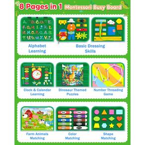 Gojmzo Busy Board Brinquedos Montessori para meninos e meninas - um brinquedo divertido de aprendizagem, ótimo brinquedo de viagem e escolha de presente perfeita - 8 páginas em 1 quadro ocupado Montessori: Com base no quadro ocupado tradicional com 2 páginas simples, projetamos este quadro ocupado Montessori com 8 páginas para crianças brincarem. Mais de 30 atividades de aprendizagem diferentes para os pequenos se exercitarem, como zíperes, cadarços, botões, aprendizagem do alfabeto, correspondência de formas, correspondência de cores, quebra-cabeças de dinossauros, aprendizagem de relógio e calendário, jogo de fazenda, jogo de rosquear, etc. - Brinquedo de aprendizagem divertido sem fim: Este livro ocupado para crianças de 1 a 3 anos é baseado na teoria da educação Montessori para projetar, ajudando as crianças a desenvolver muitas habilidades, incluindo habilidades básicas de vida, coordenação motora fina, coordenação olho-mão, capacidade de raciocínio e capacidade de resolução de problemas, etc. Seus pequenos entes queridos terão inúmeros entretenimento enquanto jogam este quadro de atividades colorido! - Placa sensorial segura: nossa prancha ocupada para crianças é feita de material de feltro macio e adequado para crianças com bordas lisas. Todas as peças de costura deste livro ocupado são reforçadas e não caem facilmente, mantendo seus filhos ocupados e seguros. - Brinquedo portátil de viagem: leve e portátil, nossa prancha ocupada é um excelente brinquedo de viagem para crianças carregarem, perfeito para atividades de viagem de carro e avião. Desfrute de um tempo tranquilo para você mesmo em uma viagem de carro e de avião! - Ótima ideia de presente: com seu design exclusivo e atividades divertidas de aprendizagem, este quadro ocupado pode facilmente atrair a atenção da criança. É uma ótima ideia para meninos e meninas de 1 2, 3 e 4 anos de idade como presente de aniversário e Natal.