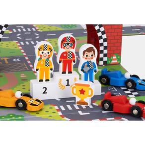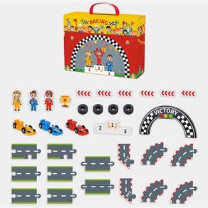 Descrição do Produto As crianças poderão usar a imaginação e brincar em qualquer lugar com essa linda caixa, que tem uma alça para ser levada para onde quiser. Quando aberta, é só pegar as 34 peças e montar o cenário com pista e carrinhos de corrida.