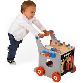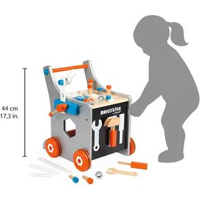 Brinquedo Completo para Pequenos Construtores! 25 acessórios inclusos, entre pregos, parafusos, porcas e tábuas perfuradas. 3 ferramentas magnéticas: martelo, chave de fenda e chave inglesa, fáceis de armazenar no carrinho. Sistema anti-inclinação, garantindo mais segurança enquanto a criança brinca e caminha. Eixos de metal nas rodas, oferecendo mais resistência e estabilidade. Pintura serigrafada e acabamento seguro, feito com madeira sustentável certificada FSC®.