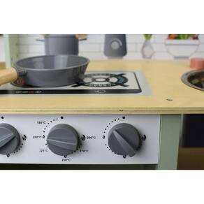 Este brinquedo com tudo incluído possui forno, fogão e pia, permitindo que as crianças se envolvam em aventuras culinárias imaginativas. O conjunto vem completo com utensílios de cozinha de madeira e plástico, uma panela e uma frigideira, proporcionando aos chefs mirins tudo o que precisam para preparar deliciosas refeições de faz de conta. A bancada e as prateleiras de madeira oferecem amplo espaço de armazenamento para todos os itens culinários, enquanto as quatro pernas de madeira garantem estabilidade durante a brincadeira. Com este brinquedo, as crianças podem criar o seu próprio cenário de cozinha, experimentando diferentes receitas, praticando os seus dotes culinários e explorando a alegria da preparação dos alimentos. É uma maneira fantástica de incentivar a criatividade, a encenação e a interação social enquanto eles servem suas criações culinárias para familiares e amigos.