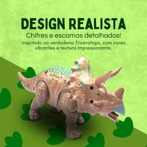 - Design detalhado e colorido, com chifres e escamas que imitam a aparência do Triceratops verdadeiro.