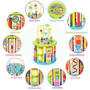 - Cubo de atividades: inclui labirinto de contas de madeira de 12,4 x 6,9 polegadas, contas de contagem coloridas, combinação de formas, equipamento arco-íris, Track Glide, Animal Flip, relógio digital, emparelhamento de personagens, xadrez voador e função de pesca