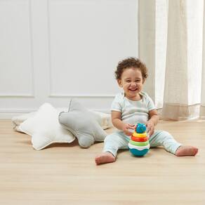 O Dino Teimoso é composto argolas coloridas interativas e o desafio da brincadeira é encaixar todas elas sem derrubar o Dino. Uma variedade divertida de estímulos.