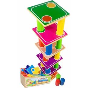 cada participante tira uma plaquinha de cada vez e coloca os pinos coloridos nos lugares correspondentes, montando e equilibrando a torre. O participante que derrubar a torre perde