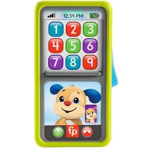 Smartphone de brinquedo interativo com os amigos Laugh & Learn, Cachorrinho e irmã do cachorrinho, além de luzes, sons e músicas educativas divertidas. Mais de 75 músicas, sons e frases ensinam os números e a contagem, formas, cores, sentimentos e clima. Use o botão do globo para selecionar um idioma: Espanhol, português, ou inglês. 2 modos de aprendizado: Pressione os botões numéricos 1 a 9 para ver as luzes e músicas. Deslize a aba para cima para revelar 9 botões de aplicativos com músicas e frases novas. Pressione o botão da câmera para ativar sons e frases divertidos, além de alternar o botão na lateral para ouvir sons de clique.
