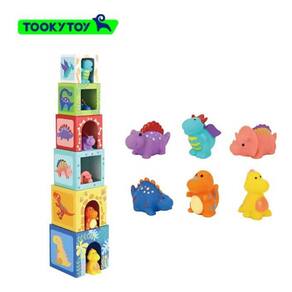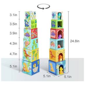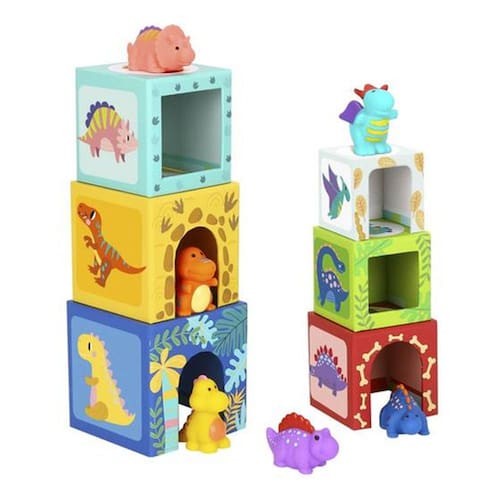 as crianças podem empilhar os blocos para fazer uma torre alta e aninhar dinossauros dentro da caixa colorida.